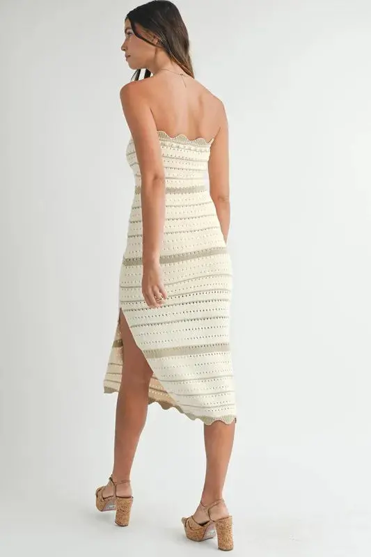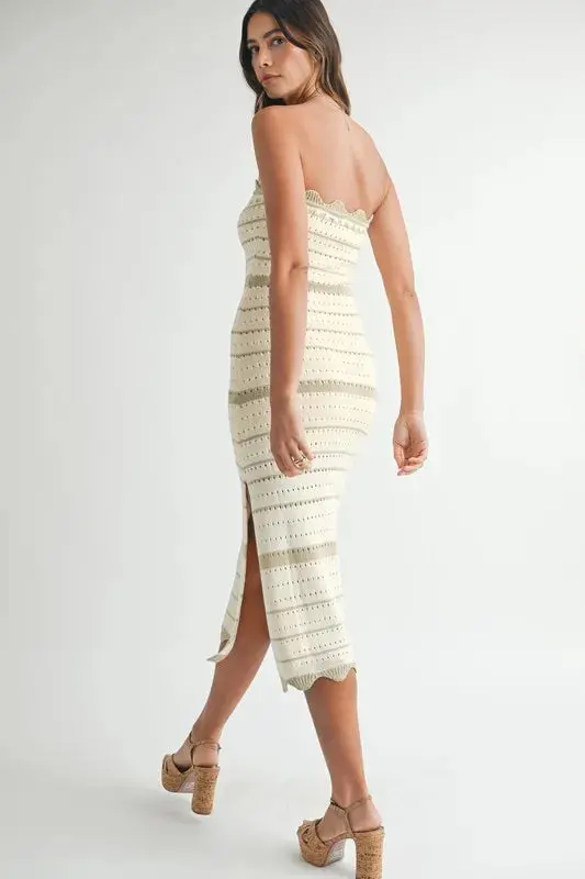 This midi dress has a unique contrast striped crochet knit design, flattering silhouette, and intricate details for a stylish wardrobe statement.